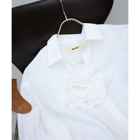 シンプルなシャツに立体感のあるコサージュを添えることで、着こなしにさりげないアクセントをプラスしました。