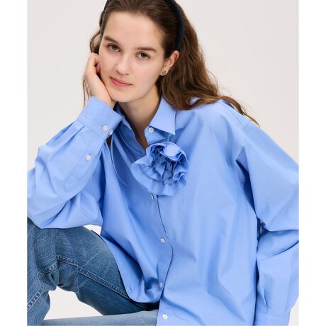 シンプルなシャツに立体感のあるコサージュを添えることで、着こなしにさりげないアクセントをプラスしました。