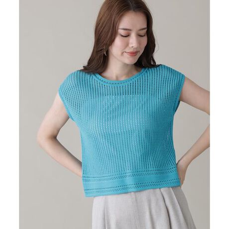繊細な透け感と立体的な編み柄が印象的なニットプルオーバー。縦ラインを強調する編地が、すっきりとした印象を与えながら、軽やかな抜け感を演出します。肩まわりは程よくカバーするフレンチスリーブデザインで、腕をきれいに見せてくれるバランスに。ウエスト位置には透かし編みの切り替えを施し、自然なメリハリと女性らしいシルエットをプラスしています。一枚で着映えするデザインながら、同素材のスカートと合わせれば、より洗練されたセットアップスタイルが完成します。