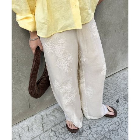 シアーな生地に花柄の刺繍が入ったイージーパンツに、薄手のサテンのイージーパンツがレイヤードされている2WAY仕様のパンツ。インナーパンツは内側のボタンで取り外し可能です。