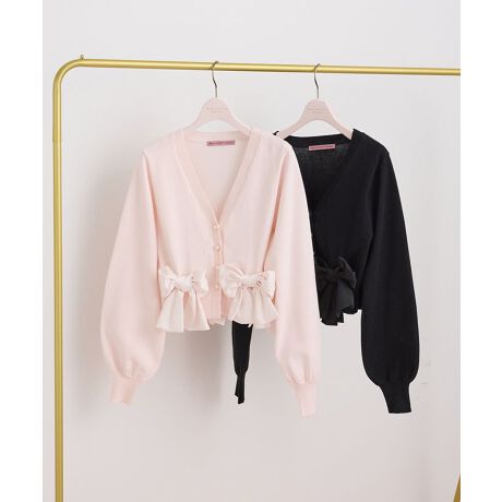 前後にあしらったボリュームたっぷりのリボンと、パールボタンが華やかさを添えるカーディガン。