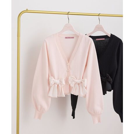 前後にあしらったボリュームたっぷりのリボンと、パールボタンが華やかさを添えるカーディガン。