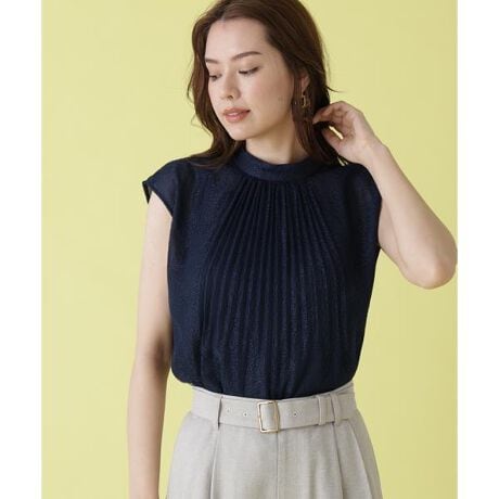 胸元にあしらった繊細なプリーツが上品な雰囲気を演出するスタンドカラーブラウス。ウエストより高い位置でプリーツを自然と消す事によりボトムにインしたスタイリングもウエスト周りをすっきりと見せてくれます。透け感のあるレースに同色のインナーキャミソールを挟んで軽やかな印象に仕上げました。