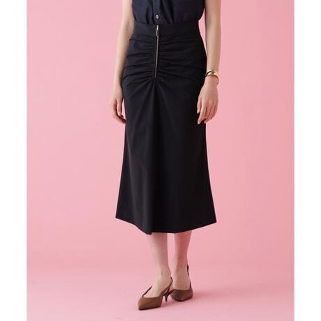 フロントはジップデザインでシャープな印象に仕上げ、放射線状にあしらったタックギャザーが華やかさをプラス。ヒップはすっきりとタイトに、裾にかけてやや広がる女性らしいシルエットが印象的なスカートです。2WAYストレッチ素材で、快適な着心地も兼ね備えています。