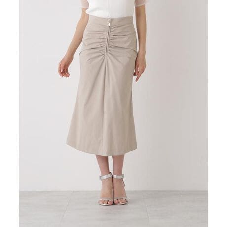 フロントはジップデザインでシャープな印象に仕上げ、放射線状にあしらったタックギャザーが華やかさをプラス。ヒップはすっきりとタイトに、裾にかけてやや広がる女性らしいシルエットが印象的なスカートです。2WAYストレッチ素材で、快適な着心地も兼ね備えています。