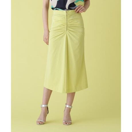 フロントはジップデザインでシャープな印象に仕上げ、放射線状にあしらったタックギャザーが華やかさをプラス。ヒップはすっきりとタイトに、裾にかけてやや広がる女性らしいシルエットが印象的なスカートです。2WAYストレッチ素材で、快適な着心地も兼ね備えています。
