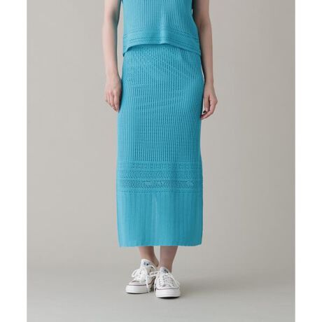 縦に流れる編み柄が美しい、ニットロングスカート。ストンと落ちるシルエットで、体のラインを拾いすぎず、上品で大人らしい印象に仕上げています。裾にかけて切り替えた透かし編みデザインが、足元に軽やかな表情をプラス。動くたびにニュアンスが生まれ、シンプルながらも存在感のある一枚です。ウエストはリラックス感のある穿き心地で、デイリーにも取り入れやすいのが魅力。同素材のプルオーバーとセットアップでの着用はもちろん、シャツやカットソーと合わせた単品使いでも幅広く活躍します。