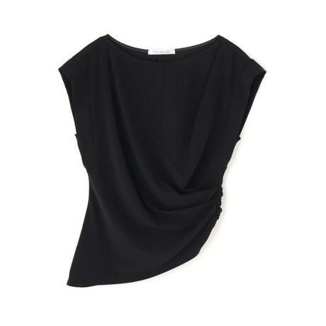 すっきりとしたネックラインと、二の腕をさりげなくカバーするカフススリーブがシャープな印象を与えるトップス。サイドからアシンメトリーにあしらったタックドレープが女性らしい柔らかさを添え、さらにアシンメトリーにカットしたヘムラインがスタイリング全体を引き締めます。シャープさとフェミニンさを兼ね備えた一着です。