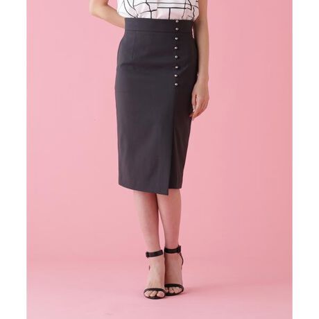 パール調のホワイトシルバーボタンを並べたタイトスカート。ボタンは見せかけのループで留めたデザインで、ディテールにもこだわった高級感のあるデザインです。サイドベンツからの斜めのヘムラインがシャープな印象を与えます。