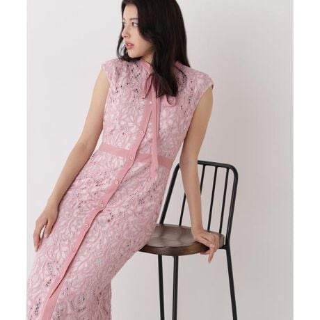 身体のラインに程よく沿った細身のシルエットが女性らしい雰囲気のレースワンピース。スタンドカラーが凛とした印象で細めのリボンをあしらうことで更に女性らしさもプラス。襟と前立て、ウエストを無地で切り替える事によりメリハリを与え、すっきりとした印象に仕上げました。ヒップ下で切り替えマーメイドラインを出した、後ろ姿も女性らしいシルエットのワンピースです。