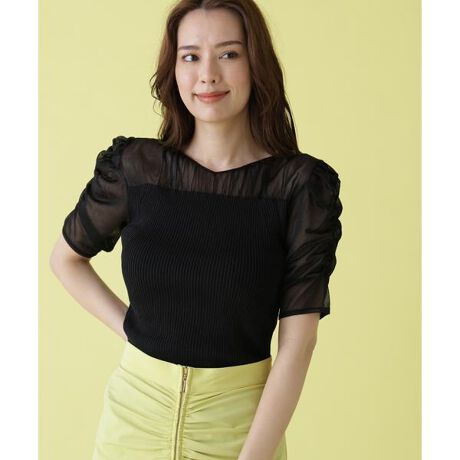 シアー素材をドッキングしたデザインが、さりげない肌見せを叶えるニットプルオーバー。デコルテと袖には透け感のある軽やかな編地を使用し、フェミニンで抜け感のある印象に仕上げました。身頃はリブ編みで、縦ラインを強調しながら程よく身体にフィット。立体的な編地切り替えにより、すっきりとしたシルエットを演出します。袖はややボリュームを持たせた5分袖で、気になる二の腕を自然にカバーしつつ、女性らしい柔らかさをプラス。