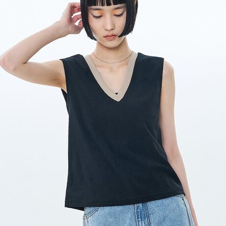 NOMINEのパイルタンクは、前後で表情が変わる2WAY仕様が魅力。深めVネックとラウンドネックを気分で切り替えられ、デコルテにほどよい抜けをつくります。パイル素材を使用し、無地とストライプで印象をチェンジ。衿ぐりの配色リブがさりげないアクセントになり、顔まわりまですっきり見せます。着丈52cmの短めバランスは、インせず決まる今っぽさと、上品なミニマル感を両立。ひとさじのトレンド感を効かせながら、毎日に寄り添う“ちょうどいい”一枚です。