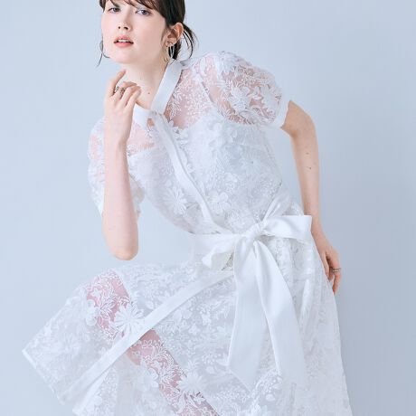 ・透け感と張り感のある軽い素材に立体的なフラワーモチーフをのせ高級感ある素材を使用したデザインワンピース。