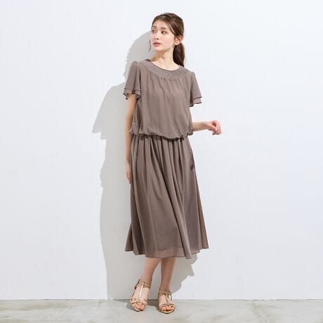 素材選びからデザイン、パターンまでを一貫して行い、タックの向きやギャザー分量、フリル位置などを36・38・40号と42・46・50号では調整し、パターンを分けることで美しいシルエットと着心地の良い服を提案します。