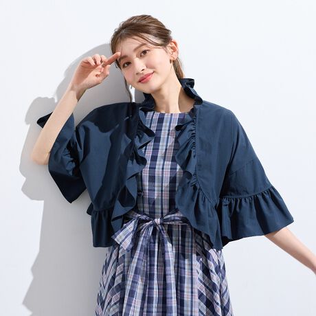 ・立体的にあしらったフリルが華やかさを引き立てる、フェミニンなショートボレロ