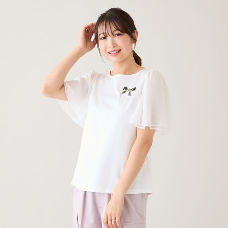 ・透け感のあるシフォンを2枚重ねたフレア袖が、軽やかで華やかなアクセントに
