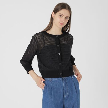 [型番:55N11759__]◆ナチュラルな印象のレース素材カーディガン【Design】ポコポコとした表情が特徴のレース素材を使用したカーディガン。衿・袖口・裾のリブがアクセントになった、レースとのコンビネーションがポイントです。異素材ミックスならではの表情豊かなデザインで、羽織るだけでスタイリングに華やかさをプラスします。短めの着丈と、ふんわりとした袖のシルエットがバランスよく、スタイリッシュに着こなせる一枚です。