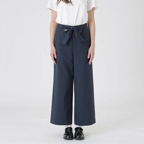 [型番:55R08741__]◆ウエストリボンがポイントのワイドパンツ【Design】清涼感のある綿麻混紡糸を使用したパンツです。短丈のトップスと相性抜群のワイドシルエットです。ウエストリボンは取り外し可能で、リバーシブルでご使用いただけます。【Fabric】本体:接触冷感、吸水速乾、UV、防透け機能を備えた素材です。