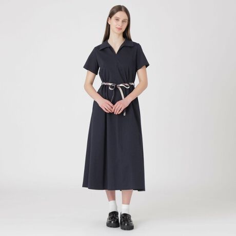 [型番:56J01779__]◆動きやすさと上品さを兼ねたポンチドレス【Design】スキッパーデザインが程よい抜け感を演出するジャージードレス。適度なゆとりを持たせたシルエットは、Aラインに広がる優雅なフォルムでリラックス感も抜群です。デイリー使いはもちろん、きれいめスタイルにもマッチする一枚です。