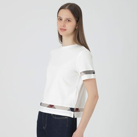 [型番:56P03778__]◆クレストブリッジチェックのラインがポイントのTシャツ【Design】袖と裾のクレストブリッジチェックのラインがポイントのTシャツです。ややタイトめなボックスシルエットです。シンプルながらも存在感のあるチェック使いがアクセントになった一枚です。※展開店舗については、予告なく変更になる場合がございます。