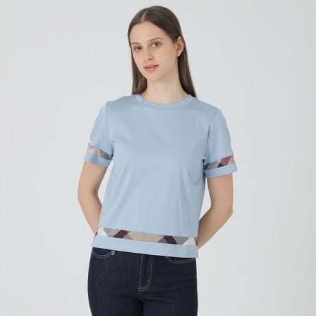 [型番:56P03778__]◆クレストブリッジチェックのラインがポイントのTシャツ【Design】袖と裾のクレストブリッジチェックのラインがポイントのTシャツです。ややタイトめなボックスシルエットです。シンプルながらも存在感のあるチェック使いがアクセントになった一枚です。※展開店舗については、予告なく変更になる場合がございます。