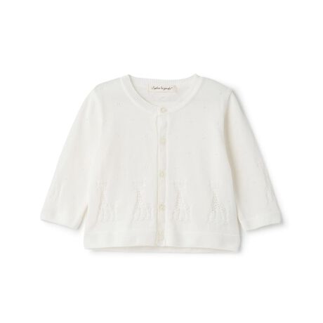 女の子らしい上品な透かし編みのカーディガンです。やわらかなコットン100%素材を使用し、快適な着心地に仕上げています。裾まわりをぐるりと囲むようにあしらったソフィーのデザインがポイント。日常に馴染みやすいやさしいカラーリングで、お手持ちのアイテムとも相性良く決まります。【おすすめの着用時期は春夏シーズン】