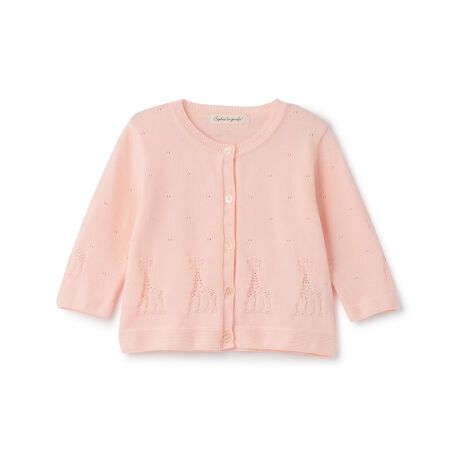 女の子らしい上品な透かし編みのカーディガンです。やわらかなコットン100%素材を使用し、快適な着心地に仕上げています。裾まわりをぐるりと囲むようにあしらったソフィーのデザインがポイント。日常に馴染みやすいやさしいカラーリングで、お手持ちのアイテムとも相性良く決まります。【おすすめの着用時期は春夏シーズン】