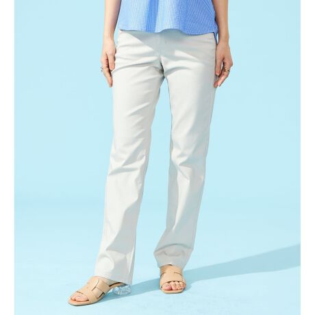 接触冷感機能のある綿リネンストレッチで、涼しい穿き心地が魅力。吸放湿性に優れた綿、接触冷感機能を持たせたポリエステル、ナチュラルな風合いとハリ感が特徴のリネンに、ポリウレタンを合わせることでストレッチ性をもたせ、夏でも快適な素材を実現しました。