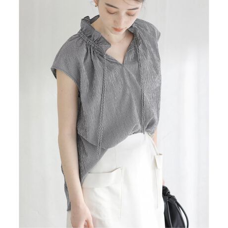 《予約》【洗える】ネックギャザーチェックフレンチブラウス