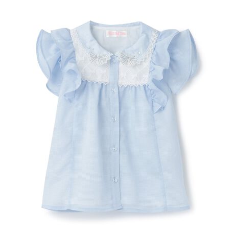 シフォンフリルと繊細なレース使いが魅力のブラウスです。ほんのり煌めくシアー生地を使用しており、上品で華やかな雰囲気がただよいます。衿先のリボンオーガンジー刺しゅうでお顔周りにアクセントをプラス。袖は肩開きになる2wayデザインで、その日の気分に合わせて着方を変えられるのもうれしいポイントです。ボトムスインでもアウトでも可愛いAラインシルエットのため、さまざまなスタイリングを楽しめます。内側にお名前を記入できるタグつき。
