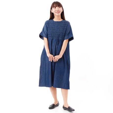 スモッキング刺繍入りデニムワンピース
