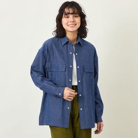 ソフトで軽い着用感のライトオンスデニム生地で仕立てたワークシャツ。カジュアルなワークシャツをベースに、パールスナップボタンで品の良さをプラス。落ち感がある肩幅とゆったりとした身幅のリラックスフィットで羽織としても活躍します。