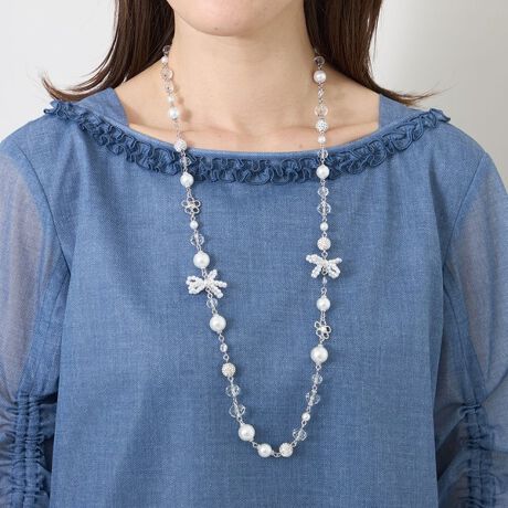 [型番:W5V34734__]リボン&フラワーネックレスパール調パーツで編んで製作したリボンパーツと透かしのフラワーパーツをメインにして、涼やかなガラスパーツを組み合わせてデザインしたTO BE CHIC らしいボリューム感のあるネックレスです。夏に向かって徐々に薄着になるトップスにとりいれてコーディネートを華やかにします。※この商品はサンプルでの撮影を行っています。実際の商品とイメージ、仕様が異なる場合がございます。