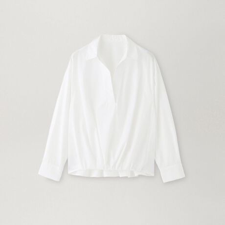 レイヤードスタイルにおすすめのスキッパーデザイン。胸元は深めの開きなので、インナーで変化を付けたスタイリングが楽しめます。全体的にゆとりを持たせたシルエットで、裾はふんわりとブラウジングさせた仕様に。体型カバーもしつつ、ほど良く抜け感のあるスタイルになります。