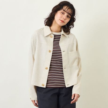 ドライタッチで軽いリネン調ポリエステルを使ったトラッカージャケット、HARLTON(ハールトン)。カフスレスや裾の切替を入れない軽い仕様にしてシャツ感覚で着れるジャケットにしました。Gジャンのようにカットソー、シャツと合わせていただけます。