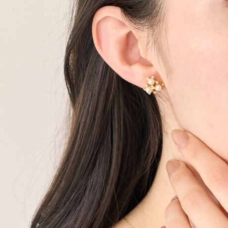 耳元に咲く、光のブーケ。艶やかなパールと細やかな輝きを放つビジューを贅沢に束ねた、気品溢れるスタッドピアスです。