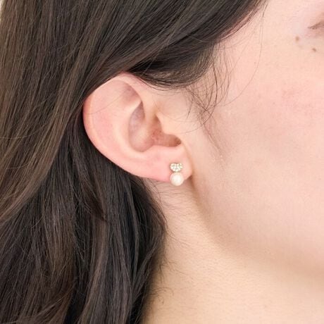 ビジューをパヴェセッティングしたハートモチーフと、艶やかな一粒パールを組み合わせた、フェミニンで上品なイヤリングです。