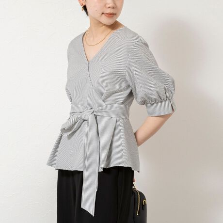 ウォッシャブルサッカーベルト付ペプラムブラウス