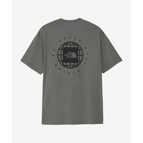 地球儀とTHE NORTH FACEのスクエアロゴを組み合わせたジオスクエアロゴのプリントを背面に大きくあしらった半袖Tシャツ