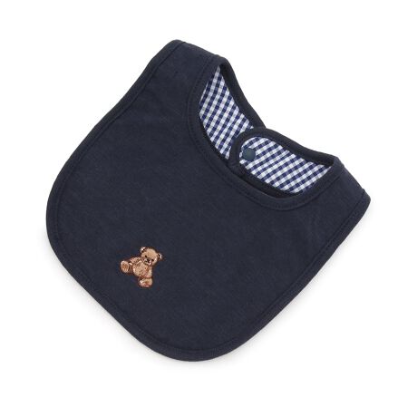 真ん中に刺しゅうしたキュートなモチーフが目を引くスタイです。チラ見えする裏地のギンガムチェックがおしゃれなアクセント。後ろにはスナップボタンを備えており、簡単につけ外しできます。やわらかな綿100%素材でやさしい肌当たりも魅力です。