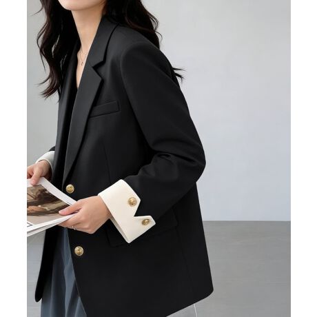 上品な金ボタンがアクセントになった、洗練されたテーラードジャケット。