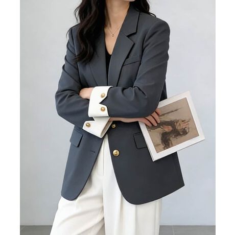 上品な金ボタンがアクセントになった、洗練されたテーラードジャケット。