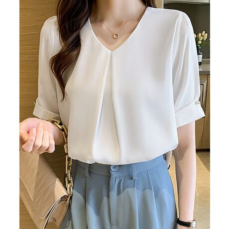 とろみのあるサテン風素材が上品な、デコルテを美しく見せるVネックブラウス。