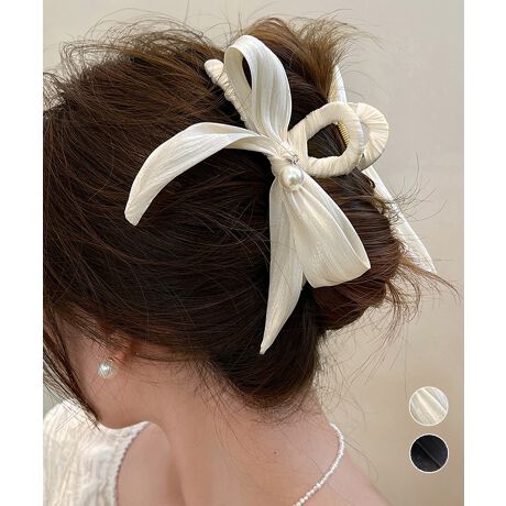 立体感のあるリボンモチーフに、さりげなく揺れるパールチャームをプラスした女性らしいデザイン。