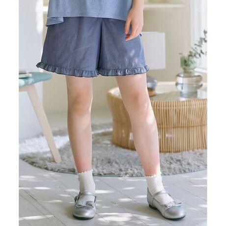 ■デザイン裾のフリルが可愛らしいショートパンツです。後ろのポケット口にスカラップとお花の刺繍をあしらい、後ろ姿まで可愛らしい1枚です。