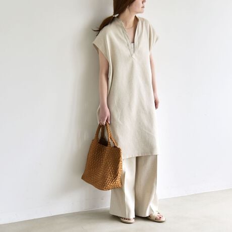 ワンピースは、肩の落ちたフレンチスリーブが涼し気で、自然を後ろに抜いて着られるラフさも兼ね備えたデザイン。