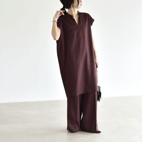 きちんと感のあるスタンドカラーのスキッパーデザインになったワンピースと、ワイドパンツがセットになったアイテム。