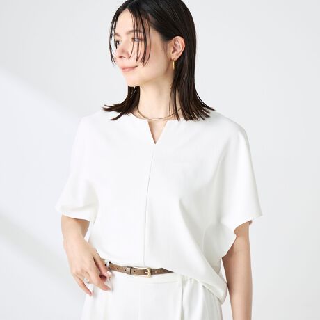 ・毎年好評の梳毛調合繊素材を使用したキーネックドルマンスリーブブラウス