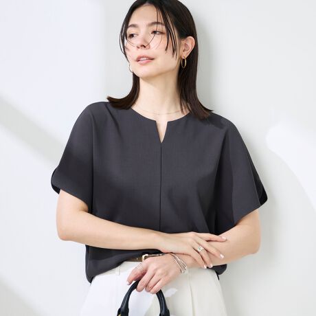 ・毎年好評の梳毛調合繊素材を使用したキーネックドルマンスリーブブラウス