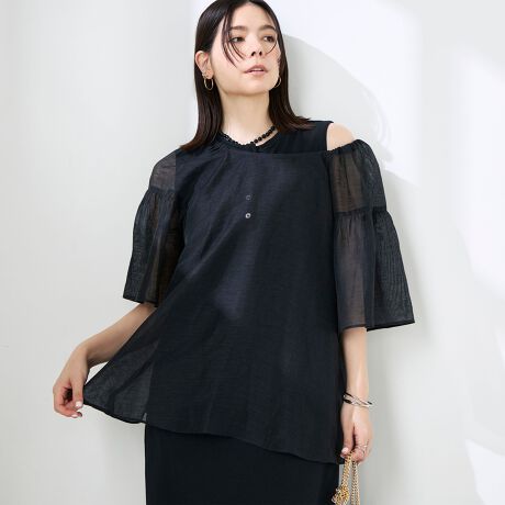 ・ドロップショルダーにギャザーを寄せたボリュームスリーブも、素材のハリ感で落ち着いた佇まいに